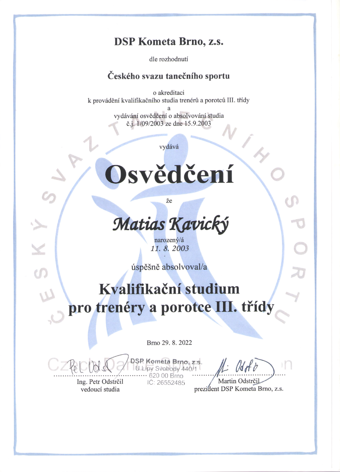 - 2022: licencovaný trenér III. třídy Českého svazu tanečního sportu
